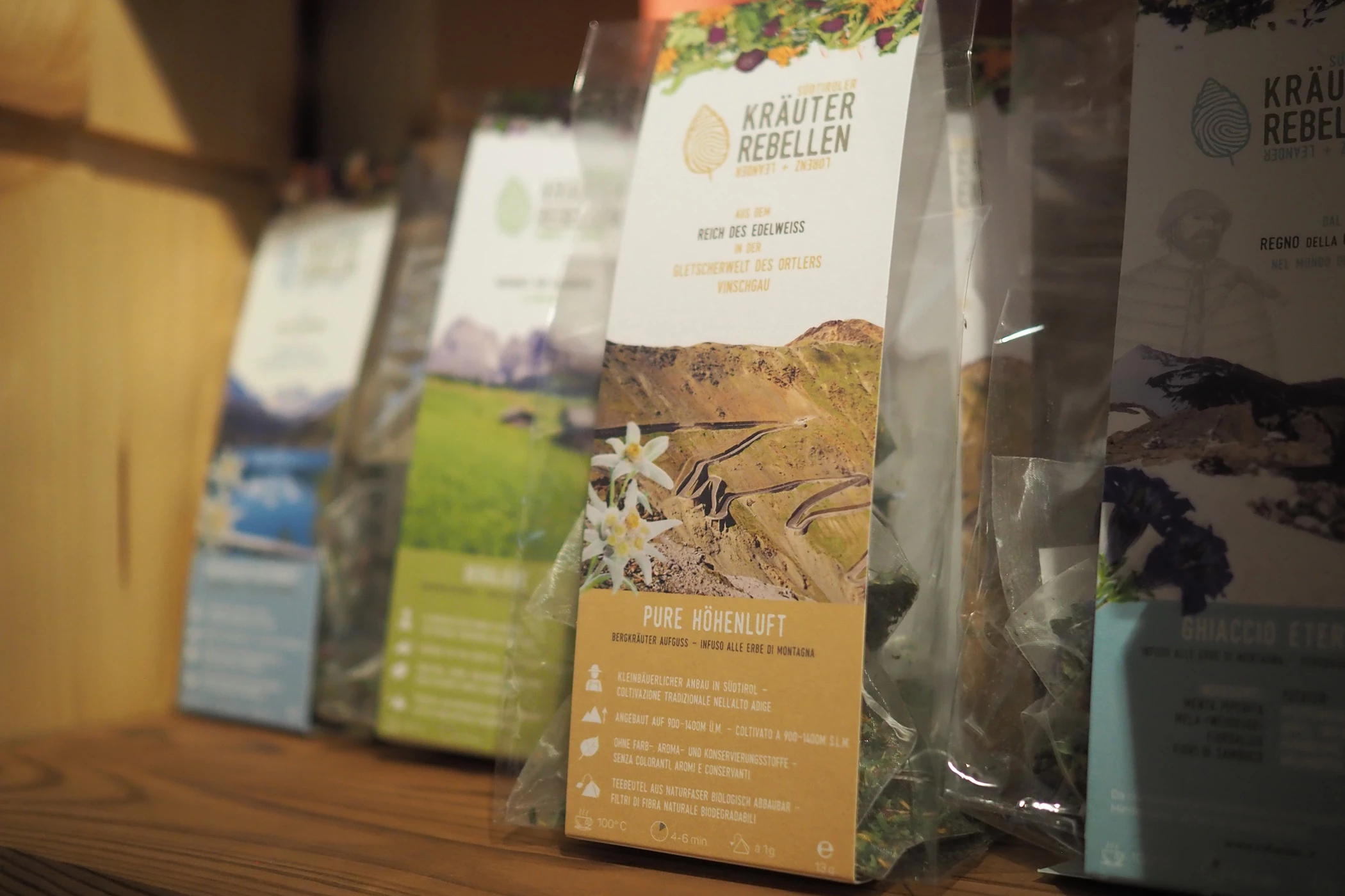 Die Kräuterrebellen im Vinschgau bauen die Bergkräuter für ihre Tees mit so klingenden Namen wie Bergdoktor, Ewiges Eis oder Sportlerin auf über 900 Höhenmetern an und ernten von Hand. Im tutti patschenggele könnt ihr diese besonderen Tees nicht nur kaufen, sondern auch direkt vor Ort genießen.