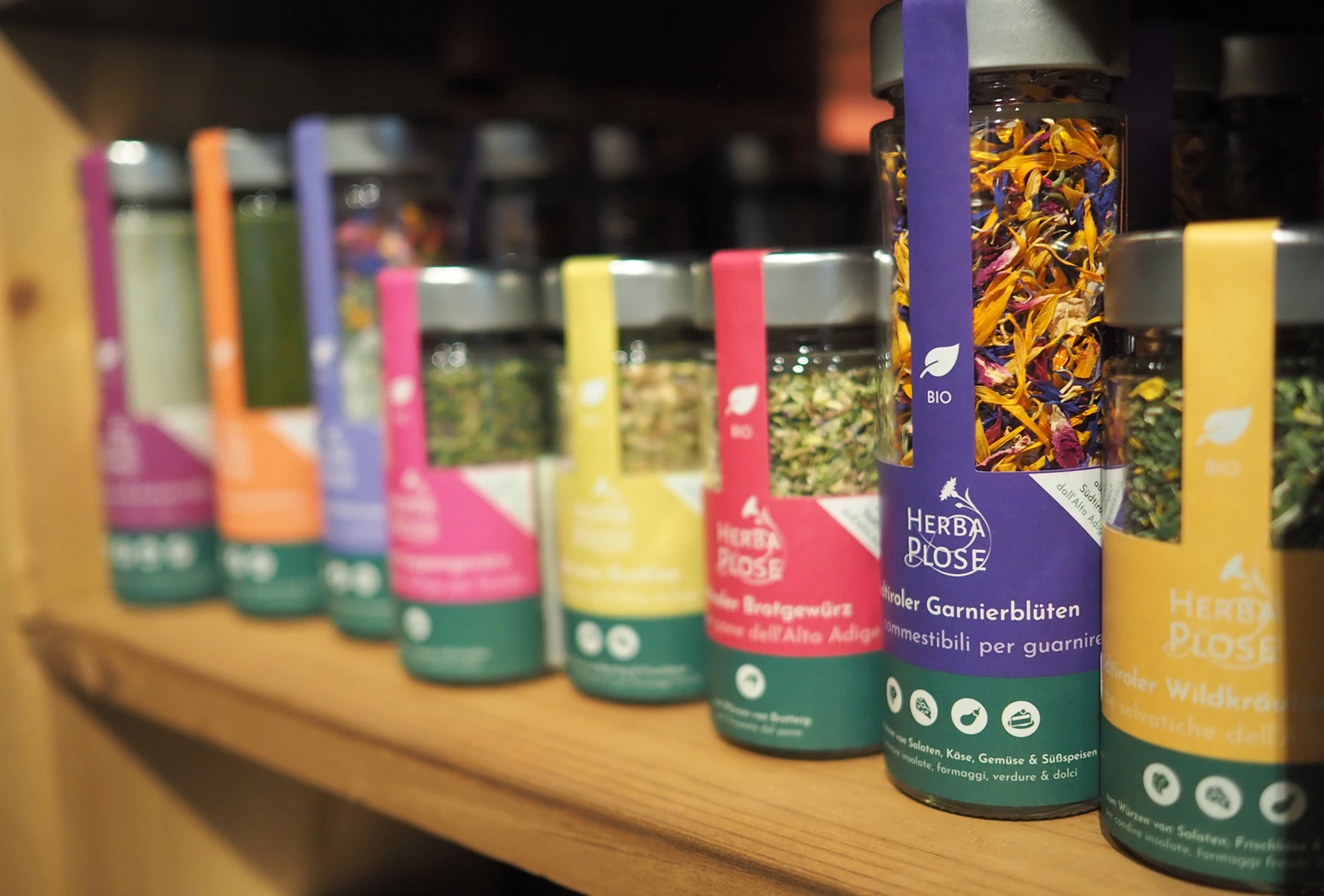 Auf dem auf 1.400 Höhenmetern gelegenen Schmiedthof über dem Eisacktal hingegen werden die über 80 verschiedenen Kräuter und Gewürze von Herba Plose angebaut und von Hand weiterverarbeitet, die im tutti patschenggele als Kräutersalze und Gewürzmischungen erhältlich sind.