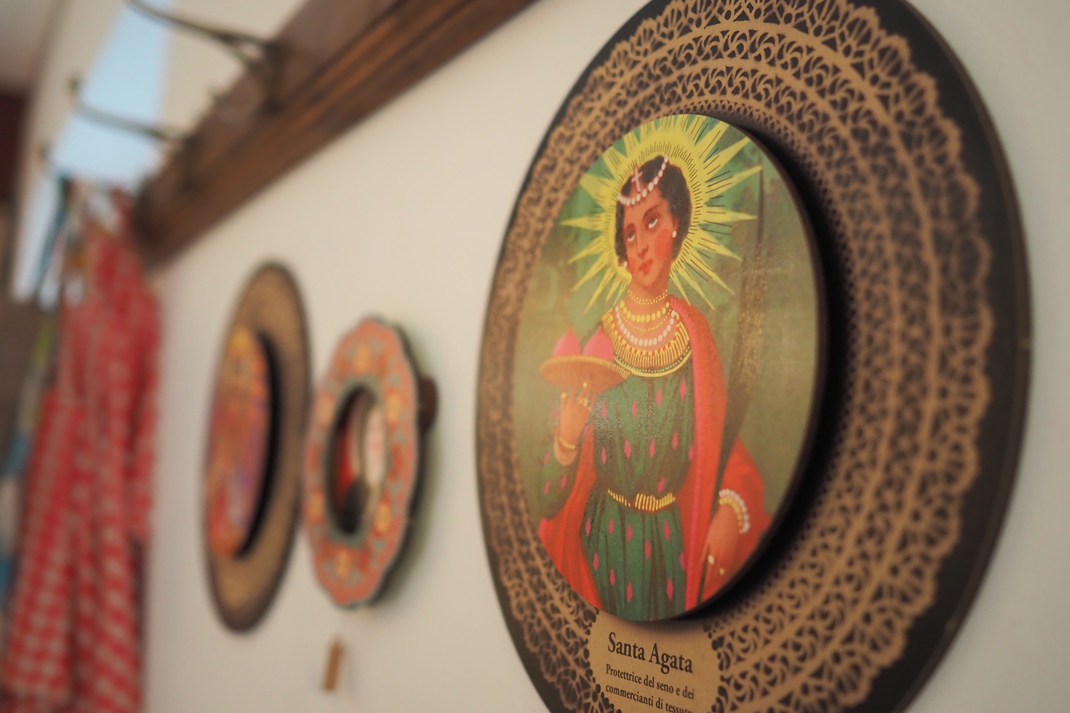 Im tutti patschenggele verkaufen wir auch poppige Ikonen von Heiligen und Schutzpatroninnen für jeden Bedarf: Als Wandbild oder Anhänger für die Handtasche, aus recycelten Materialien gefertigt und in Italien designt.