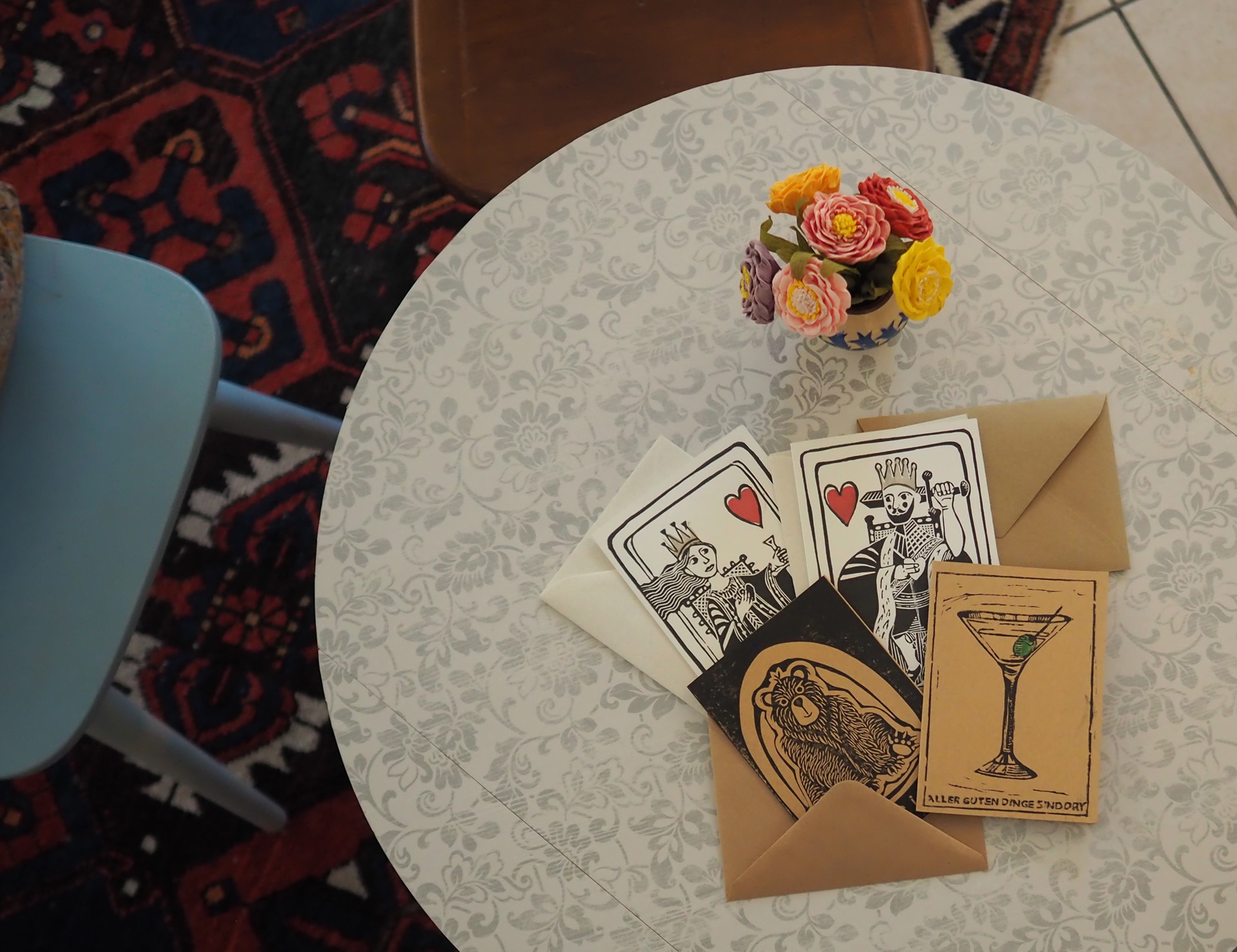 Tinis Schwester Mimi ist zwar hauptsächlich als grafische Gestalterin und Texterin tätig, trotzdem findet sie immer mal wieder Zeit für andere kreative Projekte. So zum Beispiel das Fertigen von Linolschnitten, die sie anschließend von Hand auf Naturfaserpapier druckt und die es im tutti patschenggele als Poster oder Glückwunschkarten gibt.