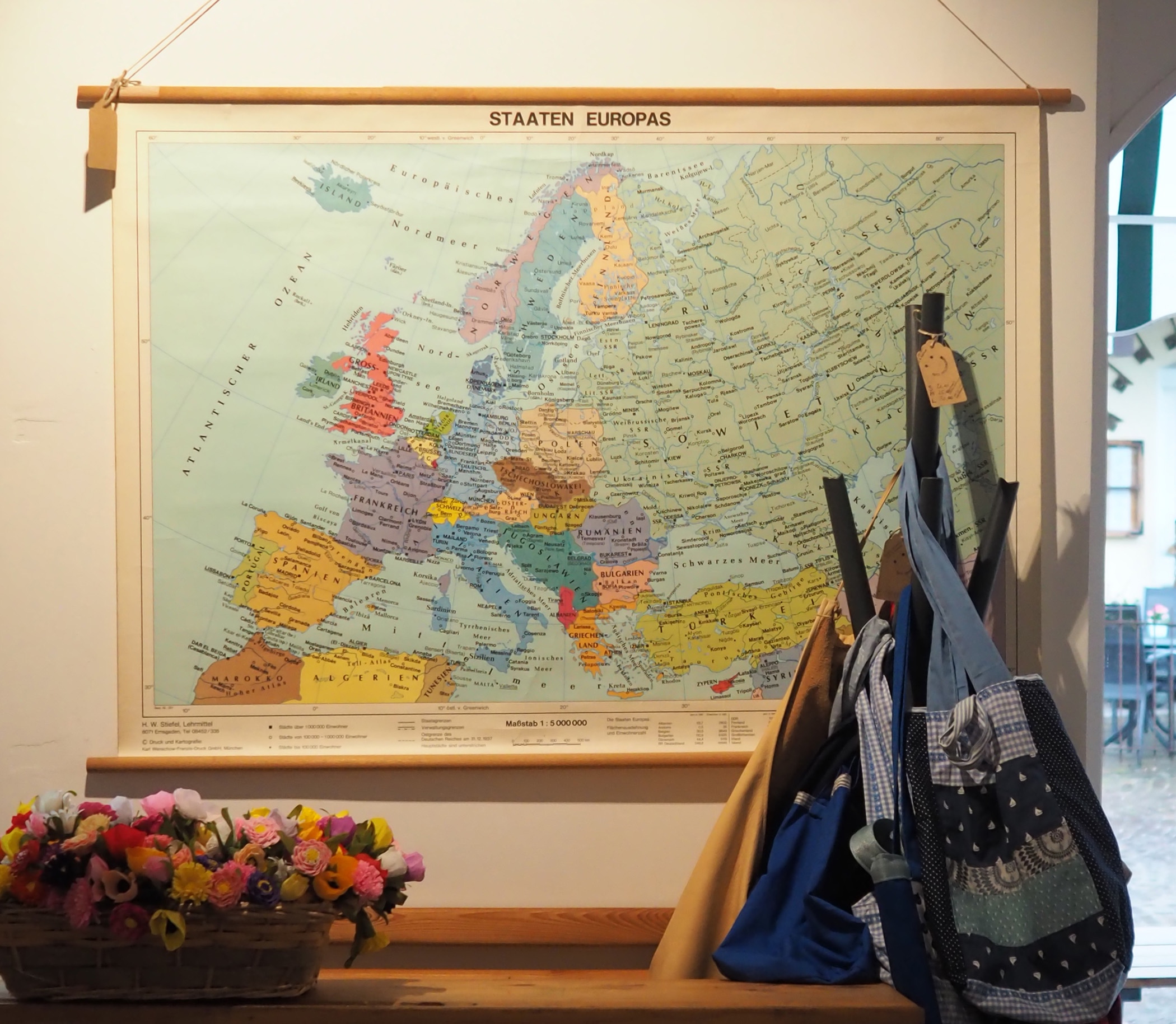 Markus und Bettina finden alte Schullandkarten schön. Deshalb hängen auch einige im tutti patschenggele. Aber sobald sie an der Wand hängen sind sie auch schon wieder verkauft. Zum Glück haben wir ein großes Sortiment.
